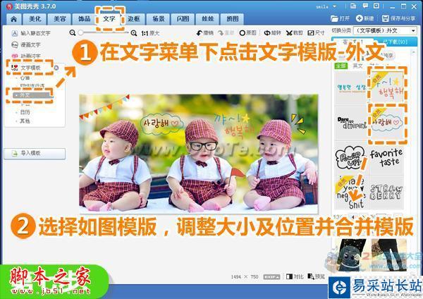 7、進入“文字”菜單下點擊“文字模版-外文”分類,選擇合適寶寶的文字模板,并調整大小及位置并合并模版。
