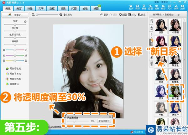 5、然后選擇“新日系”,并將透明度調至30%,使照片亮度減小。