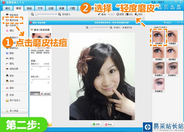 2、點擊“磨皮祛痘”,選擇“輕度磨皮”,使照片降噪,提高照片質量。
