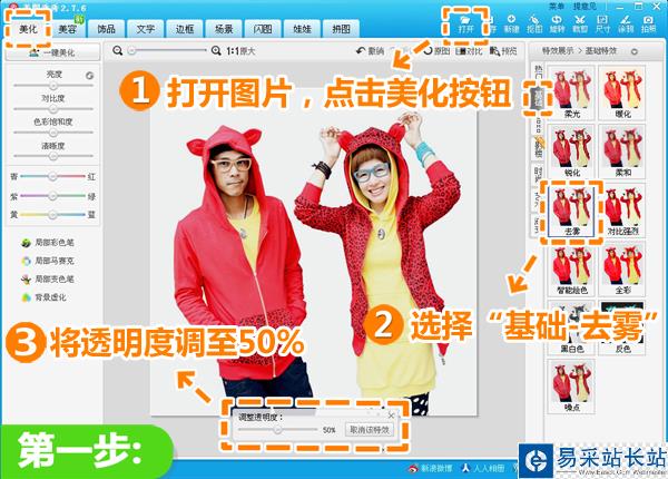 1、在“美圖秀秀”中打開待處理的照片,進入“美化”菜單下,選擇“基礎-去霧”,并將透明度 調至50%,提亮照片色彩度。