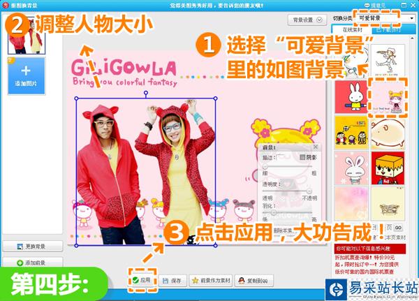 4、選擇“可愛背景”里的如圖背景,調整好人物的大小、位置,然后點擊應用,情侶隨手拍變可愛壁紙就大功告成了!