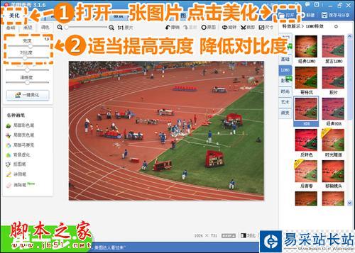 第一步:在“美圖秀秀”軟件打開一張待處理的俯拍照片,進入“美化”菜單下,適當提高亮度,調低對比度,可以收獲更好的移軸效果。