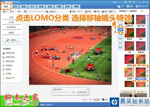 第二步:仍在“美化”菜單下,點擊“LOMO”分類,選擇“移軸鏡頭”特效,無需考慮對攝影器材和技巧的要求,一鍵打造移軸攝影。
