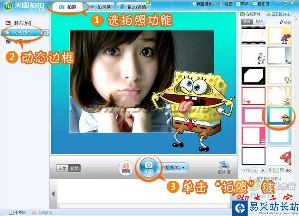 首先打開美圖拍拍軟件,如果你想拍攝靜態圖片就選擇上方的“拍照”功能,然后在左側選擇“動態邊框”,在右側選擇喜歡的樣式,最后在下方單擊“拍照”鍵即可。
