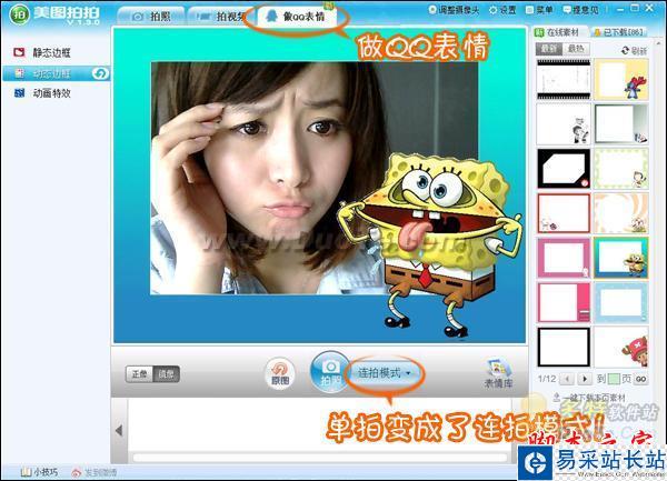 如果想拍和我一樣的動態照片,就選擇上方的“做QQ表情”功能,可以注意一下拍照模式由單拍變成了連拍模式,最后一樣按“拍照”即可。