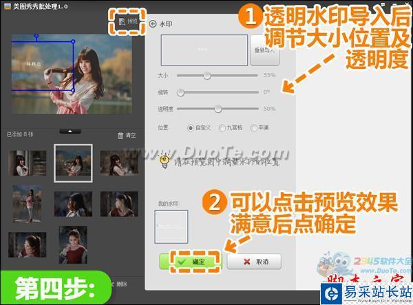 4、水印導入好后,選擇調整大小、位置和透明度。關于水印的位置由大家喜好來定,一般的常用位置有九宮格的9個位置或者平鋪方式(也是防盜系數最高的,即平鋪整個畫面)。