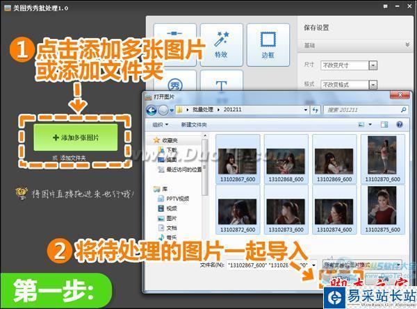 1、親們先將美圖秀秀更新至3.7.0版,熟悉的首頁上新增一個方格“批量處理”,點擊即可進入“美圖秀秀批量處理1.0”的界面,點擊“添加多張圖片”或“添加文件夾”,將要處理的多張圖片一起導入進來。