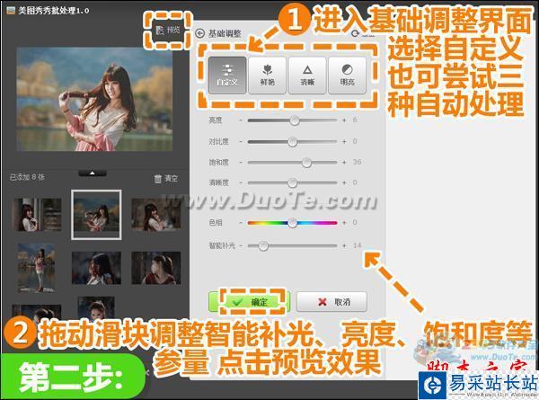 2、這一組圖片是因為拍攝時光線角度不好有了背光的問題,所以先點擊進入“基礎調整”界面下,可以嘗試三種鮮艷、清晰、明亮的自動處理。當然也可以像我這樣根據照片的實際問題,進行自定義,調節照片各種參量以達到自己滿意的效果,可點擊“預覽”。