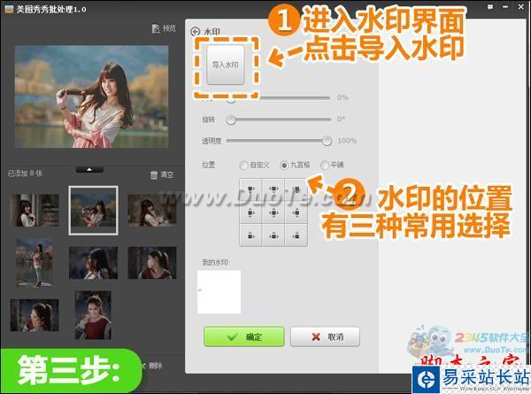 3、大家上傳到網絡分享前都會習慣給自己圖片加水印,即美觀又防盜。如果親有自己的透明水印,點擊進入“水印”界面點擊“導入水印”,將水印導入進來。