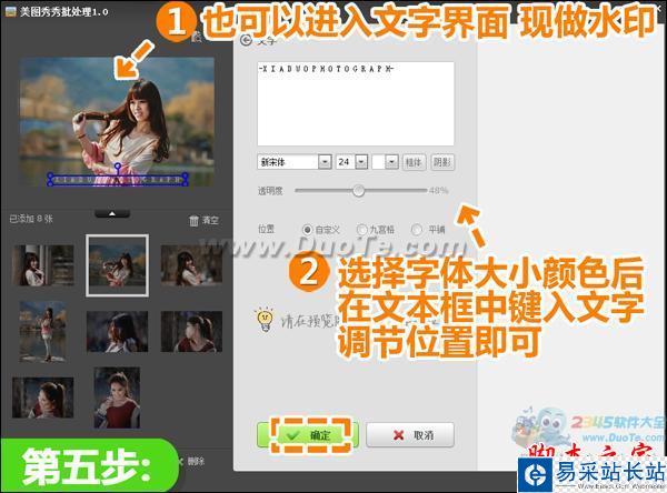 5、水印也可以現場制作,點擊進入“文字”界面,選擇合適的字體、大小和顏色后在文本框中,然后調整大小、位置、透明度即可。