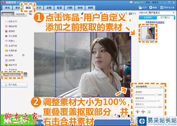 3、點(diǎn)擊“飾品-用戶自定義”選項(xiàng),添加之前摳取的素材;調(diào)整素材大小為100%重疊覆蓋摳取部分,并右擊合并素材。