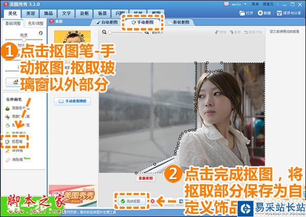 1、在“美圖秀秀”中打開一張有窗戶的照片;點(diǎn)擊“摳圖筆-手動(dòng)摳圖”選項(xiàng),摳取除玻璃窗以外的部分,然后將摳取部分保存為自定義飾品素材備用。
