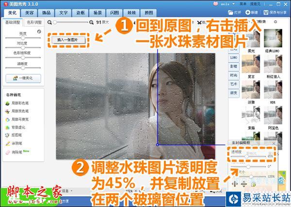 2、點(diǎn)擊右下角“原圖”按鈕,回到原圖;右擊界面插入一張水珠素材圖片,調(diào)整水珠圖片透明度為45%,并復(fù)制放置在兩個(gè)玻璃窗的位置。