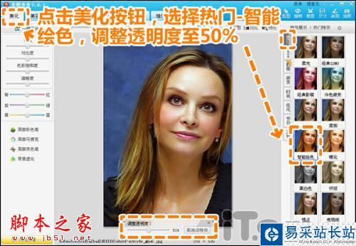 5.接著返回“美化”菜單,選擇“熱門-智能繪色”特效,并將透明度調至50%左右,增強照片色彩,讓人物臉部色澤更加神采奕奕。