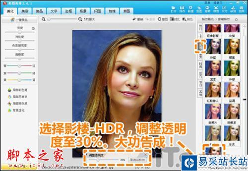 6.再選擇“影樓-HDR”特效,調節透明度到30%左右,在高光渲染下讓臉部輪廓更加立體,大功告成了~!