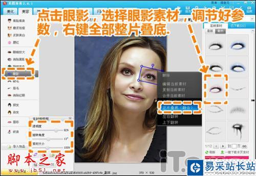 2.選擇“眼影”,在右側素材展示欄中選擇眼影素材,調節好大小透明度和角度,然后鼠標右鍵選擇正片疊底,使眼睛瞬間電力十足。
