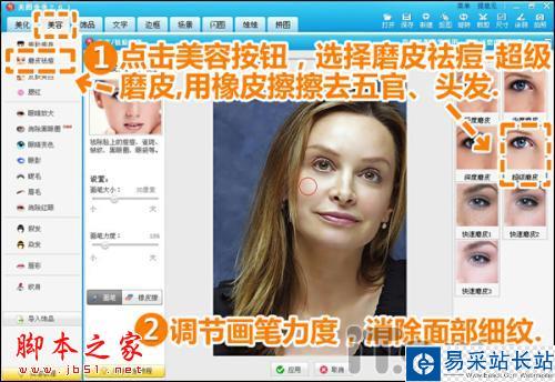 1.啟動“美圖秀秀”軟件,打開待處理的照片,直接進入美容菜單,選擇“磨皮祛痘”功能,先使用“超級磨皮”,再用橡皮擦將五官和頭發仔細擦除還原細節,再調節畫筆大小和力度,繼續完善面部。