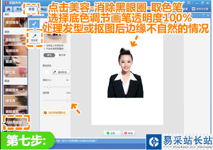 第七步、點擊美容-消除黑眼圈-取色筆,選擇底色調節畫筆透明度100%,處理發型和摳圖后邊緣不自然的情況。