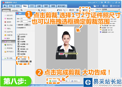 1、點擊剪裁,選擇1寸2寸證件照尺寸,也可以拖拽選框確定剪裁范圍。