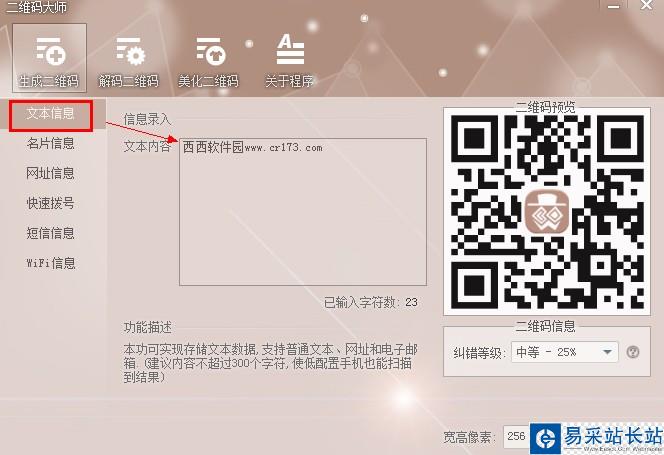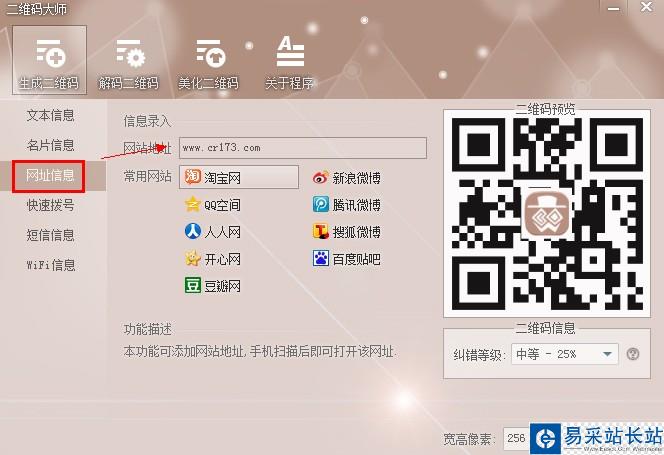 方法:根據需求填寫信息,支持各種信息輸入,如網址、短信等等。信息輸入后右邊可以預覽,最后保存即可!