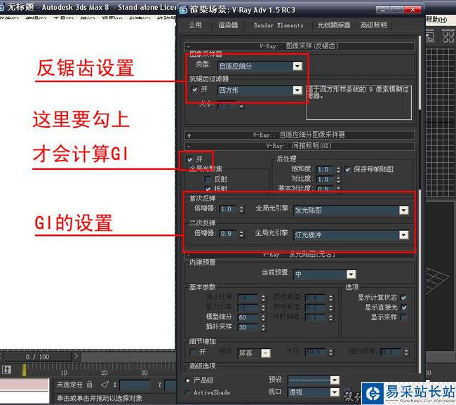 二、反鋸齒和GI設置,在此反鋸齒的抗鋸齒過濾器我用的是(四方形)