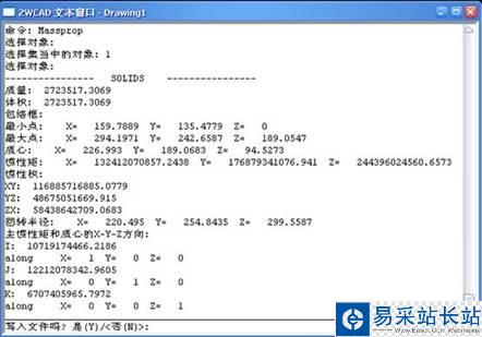 中望CAD還允許用戶將MASSPROP命令的查詢結果寫入到文本文件中,顯示查詢結果的最后系統將給出提示: