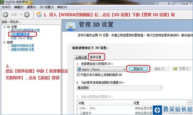 2、進入【NVIDIA控制面板】后,點擊【3D 設置】下的【管理 3D 設置】;然后選擇【程序設置】中的【 選擇要自定義的程序】,點擊【添加】按鈕: