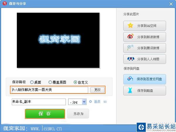 到這里熒光字體也算是制作完成了,我先教大家如何輸出吧,點擊右上角的保存與分享按鈕,緊接著就會彈出保存與分享的窗口了,然后選擇儲存的位置即可,圖片格式默認的是jpg格式。在右上角還可以把制作好的圖片分享到QQ空間、微博等快捷途徑哦,直接點擊就可以跟你的好友們分享了哦。