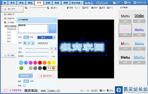 輸入了文字之后還可以調整文字的大小、樣式、顏色等等,還可以在網上下載一些字體插件,然后安裝到軟件中使用哦。右邊是文字特效,選擇熒光,馬上就能看到字體變成熒光色啦,且在文字編輯框上點擊更多可更改顏色哦。