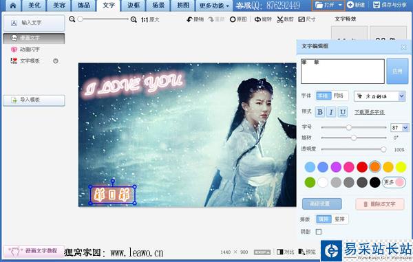 點擊文字進入到文字編輯窗口,點擊輸入文字即可在文字編輯框輸入文字啦,如:貍窩家園,這里輸入的文文字默認的是靜態文字,還有漫畫文字、動閃文字,還有一些文字模板可以套用了,這些大家可以試試,在這里就不多說啦。