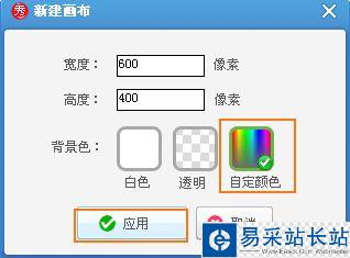 新建按鈕,畫布的高度和寬度都可以是默認的600*400像素即可,當然也可以設置為自己想要的尺寸大小。然后點擊自定顏色,選擇為黑色,再點擊應用。