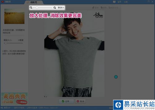 操作方法也很簡(jiǎn)單,進(jìn)入消除筆功能窗口后,根據(jù)要處理的區(qū)域大小,將圖片放大,然后用畫(huà)筆在需要消除的部位涂一涂,就可以看到完美的消除效果了(如圖 2)。實(shí)際上,這個(gè)“消除筆”功能的用處確實(shí)不小,不僅可以拿來(lái)祛斑祛痘、去水印Logo,還可以用于消除多余的路人,讓你的照片回歸干凈。有了“消除筆”這個(gè)功能,不用再為圖片瑕疵發(fā)愁了吧!