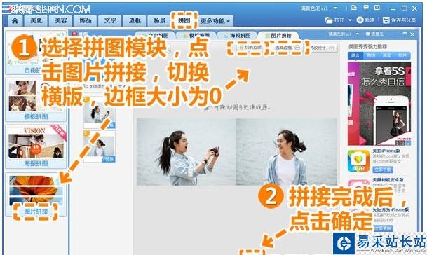 2、接著點擊“拼圖”模塊,選擇圖片拼接,切換至橫版,選擇邊框大小為0。拼接完成后,點擊確定。