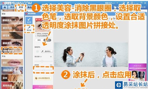 3、為了更好地融合兩張圖片,我們要對圖片拼接處進行融合。進入“美容”菜單下,選擇“消除黑眼圈”功能,并設置合適的畫筆透明度,然后用適當大小的畫筆在拼接處反復取色并涂抹,用點擊涂抹的方式即可使拼接處有很好的過渡并達到完美的融圖效果!
