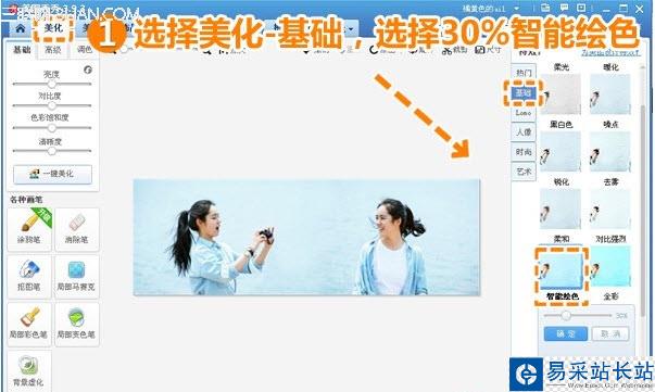 5、接著繼續選擇“基礎”選項中的“智能繪色”,透明度設置為30%。增添海水的顏色。
