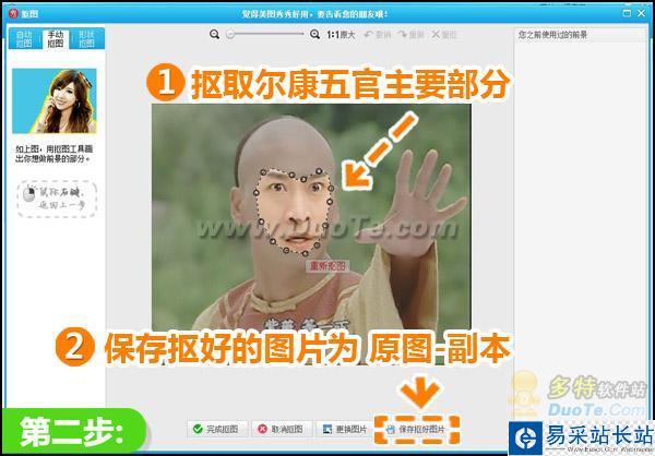 2、摳取人物的五官部分,并保存摳好圖片為“原圖_副本”,然后選擇“取消摳圖”