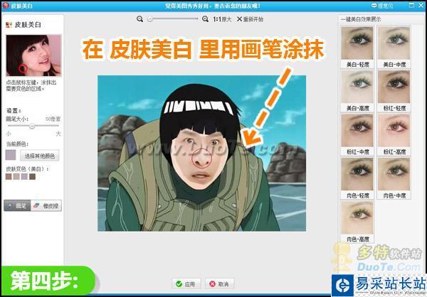 4、到“美容”菜單下,用“皮膚美白”里面的畫筆涂抹素材,讓素材的膚色更接近小李的膚色