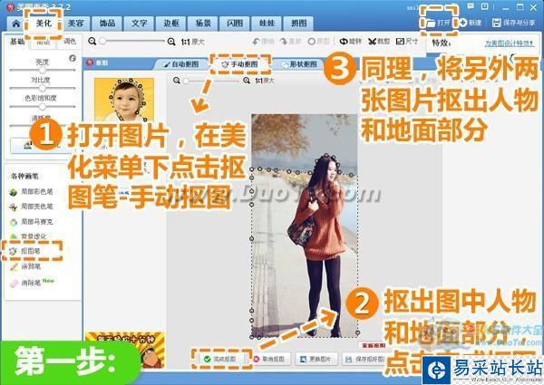 1、 在軟件下打開待處理的照片,在“美化”菜單下,點擊“摳圖筆-手動摳圖”按鈕,摳出圖中人物和地面部分,然后點擊“完成摳圖”按鈕。同理,將另外兩張圖片摳出人物和地面部分。