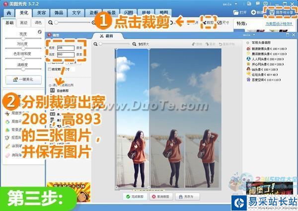3、點擊“裁剪”按鈕,分別裁剪出寬為208,高為893像素的三張圖片,并點擊“保存與分享”按鈕,保存裁剪好的圖片