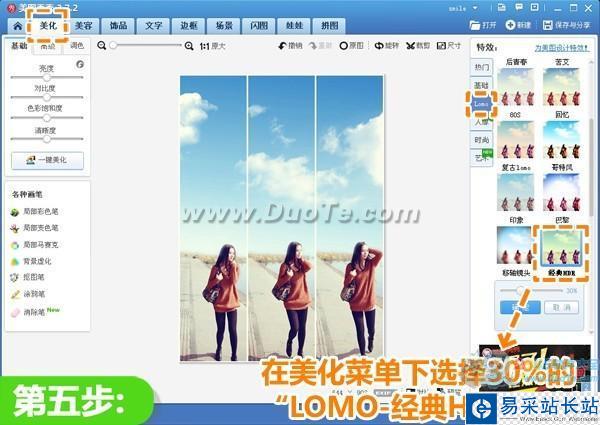 5、再返回“美化”菜單下,選擇透明度為30%的“LOMO-經典HDR”特效