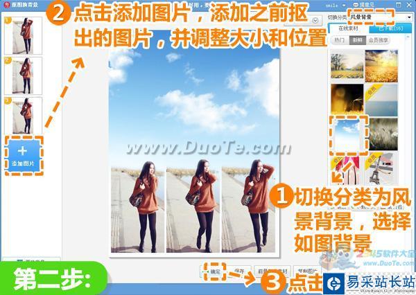 2、切換分類為風景背景,選擇如圖背景,點擊“添加圖片”按鈕,添加之前摳出的圖片,并調整大小和位置,然后點擊“確定”按鈕