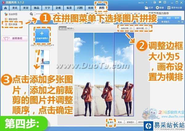 4、接著進入“拼圖”菜單下點擊“照片拼貼”按鈕,調整邊框大小為5,畫筆設置為橫排,然后點擊“添加多張圖片”按鈕,添加之前裁剪好的圖片并調整順序,再點擊“確定”按鈕