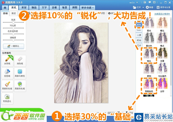 4、選擇30%的“基礎(chǔ)-智能繪色”特效,再選擇10%的“銳化”特效,大功告成!