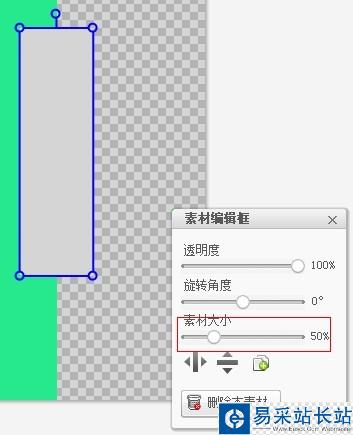 12.之后點擊那個條狀,會出現(xiàn)素材編輯框,用鼠標(biāo)拖動素材大小下的那個按鈕就可以改變素材的大小,也可以用方向鍵的←→來改變數(shù)值要到100%