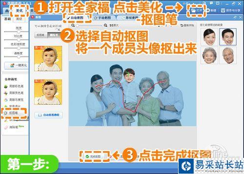 1、在“美圖秀秀”軟件下打開一張全家福照片,進入“美化”菜單下,點擊“摳圖筆—自動摳圖”,用摳圖筆在一個人的頭像上畫綠線,不需要的用刪除筆畫紅線,人像路徑確定好后,點擊“完成摳圖”。