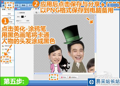 5、上面媽媽的頭發和原卡通人物頭發顏色不一致,那么進入“美化”菜單點擊“涂鴉筆”功能,用黑色畫筆將卡通人物的頭發涂成黑色,可以放大處理更方便。然后點擊“保存與分享”,選擇.PNG格式將圖片保存到電腦備用。