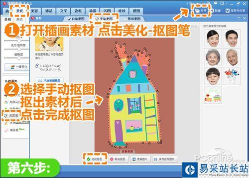 6、然后我們來制作背景圖,先百度搜索找來一些卡通插畫素材,在軟件下打開,進入“美化”菜單下用“摳圖筆—手動摳圖”將素材摳出。