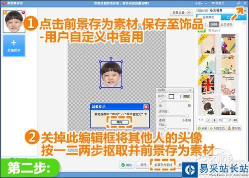 2、跳轉到新界面下,點擊“前景作為素材”,將摳取的頭像存到“飾品—用戶自定義”中,然后叉掉此編輯框,按照一二兩個步驟,將照片上其他人的頭像也摳好并存為素材。
