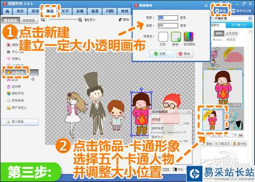 3、所有人的頭像摳好后,點擊“新建”建立一個透明畫布,然后進入“飾品”菜單下點擊“卡通形象”,按照照片中人的特點選擇合適的卡通人物,調節好各素材大小位置。