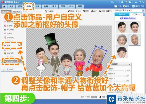 4、仍在“飾品”菜單下,點擊“用戶自定義”分類,將之前摳取好的頭像添加進來,調節每個頭像的大小位置及角度和卡通人物銜接好。不合適的地方可以做些修正,比如點擊“配飾—帽子”給爸爸加一定高帽解決卡通帽被頭像遮蓋的情況。